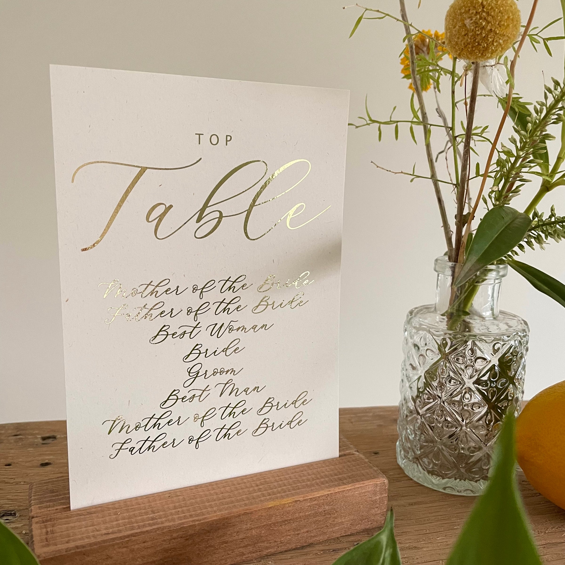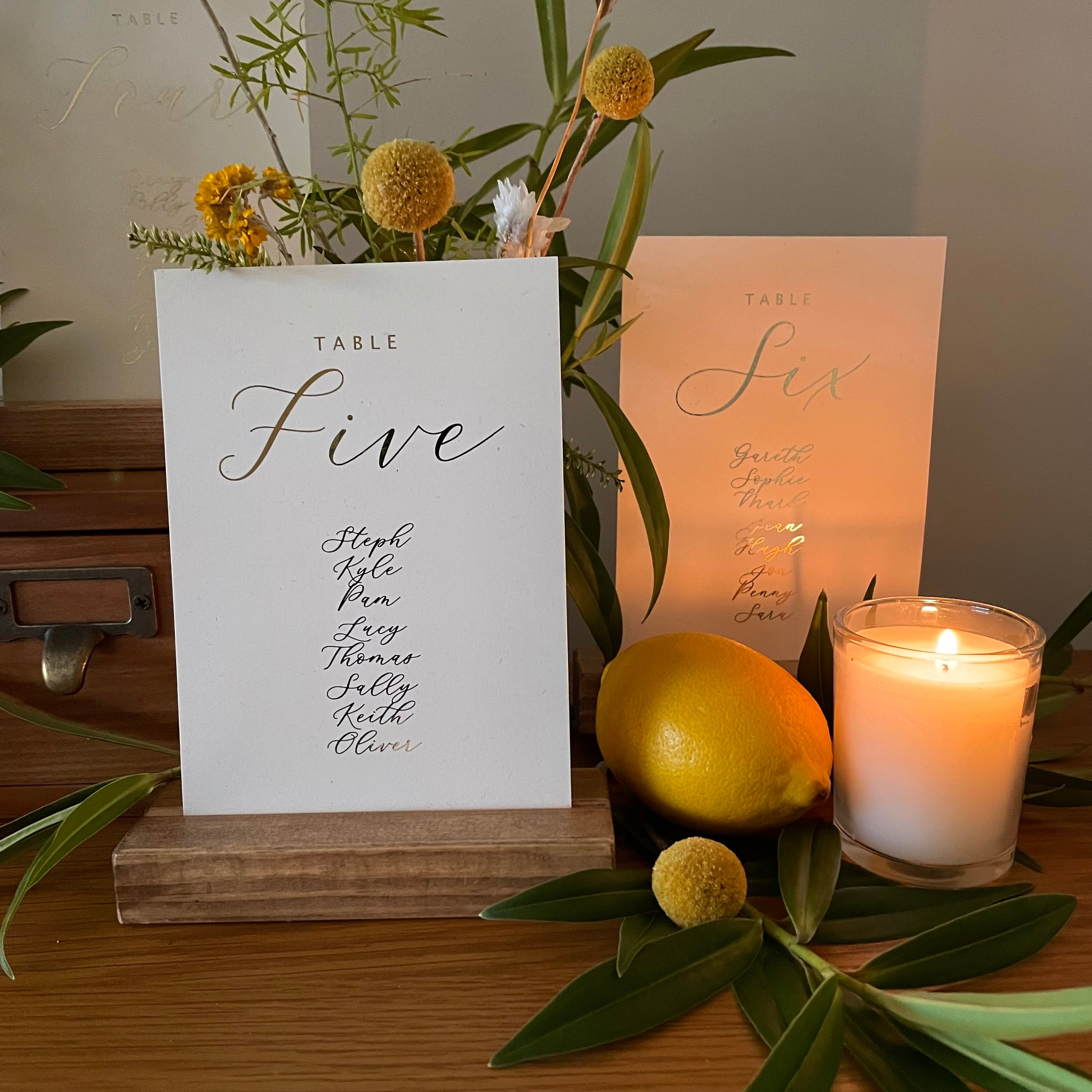 These individual table plan cards allow you to get really creative with your display for guests to find their seat. You can pop them inside frames or wooden blocks. Attach them to foam boards or an elegant mirror. The possibilities are endless. Perfect for garden style wedding receptions, rehearsal dinners or for creating a seating plan for a garden engagement party.
