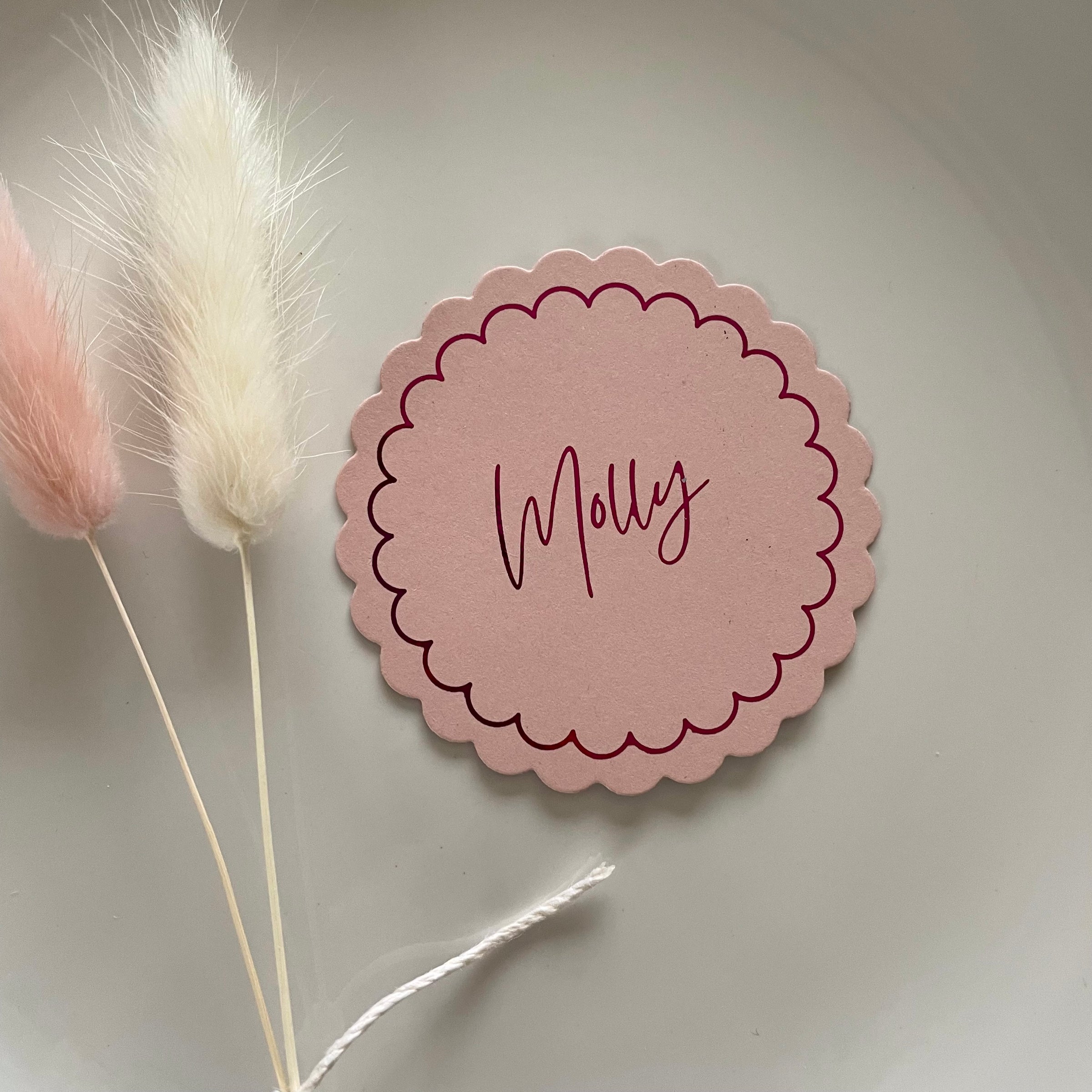 These flat scallop name cards are a really fun addition to your galentines or valentines dinner party.